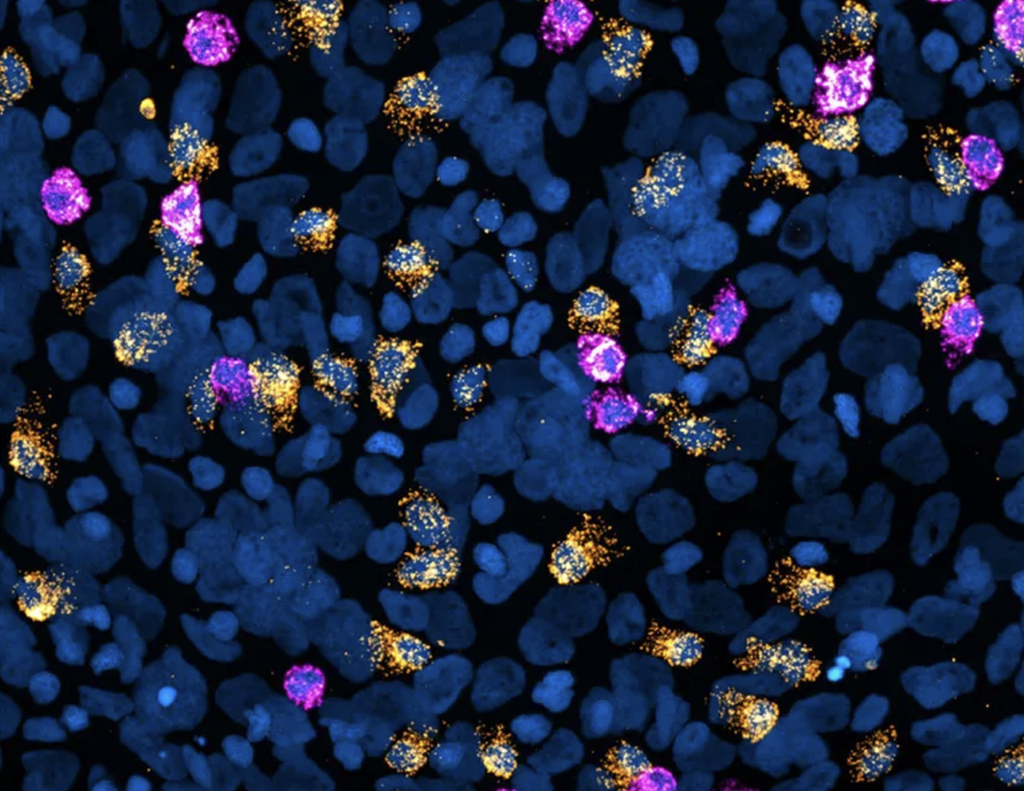 Confocal microscopy image shows cell nuclei in zebrafish skin (blue) and different types of skin ionocytes (magenta, orange).