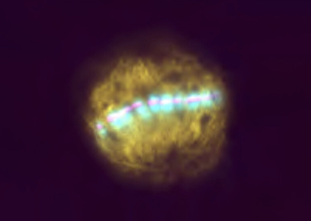 Fluorescent microscopy image of female silkworm egg arrested in metaphase I. Chromosome pairs are aligned in the center of the cell with DNA (cyan), recycled synaptonemal complex protein (magenta), and proteins responsible for separating chromosomes (yellow). Image courtesy of the Hawley Lab, Stowers Institute for Medical Research.