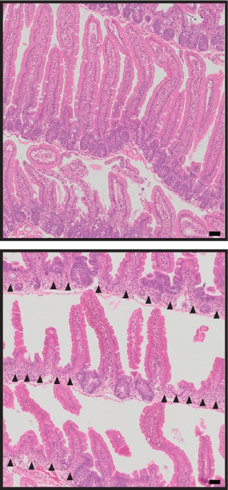 Cross section of gut lining in control mouse (top) and at seven days after silencing Frizzled5 in all intestinal epithelial cells where black arrows indicate crypt loss (bottom). Scale bar is 20 micron.