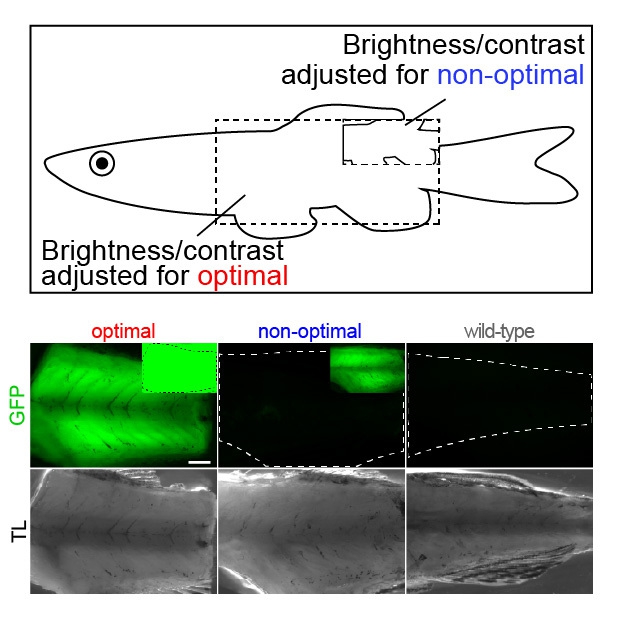 Graphical illustration indicating the imaging region of skeletal muscle (top) and fluorescent microscopy images showing optimal and non-optimal reporter gene expression compared to control zebrafish (bottom). GFP is green fluorescent protein, and TL is transmitted light. Brightness was adjusted to show differences in GFP reporter expression. Scale bar = 150mm.