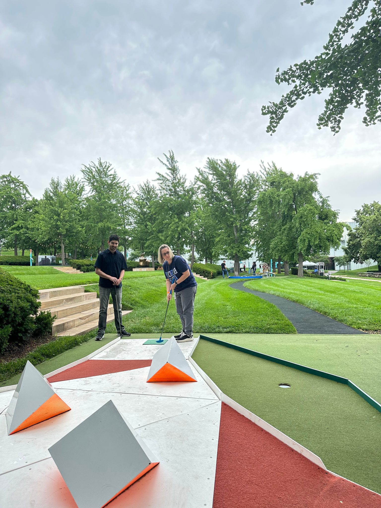 Neset and lab manager Cathy Lake discuss the difficulties of mini-golf.