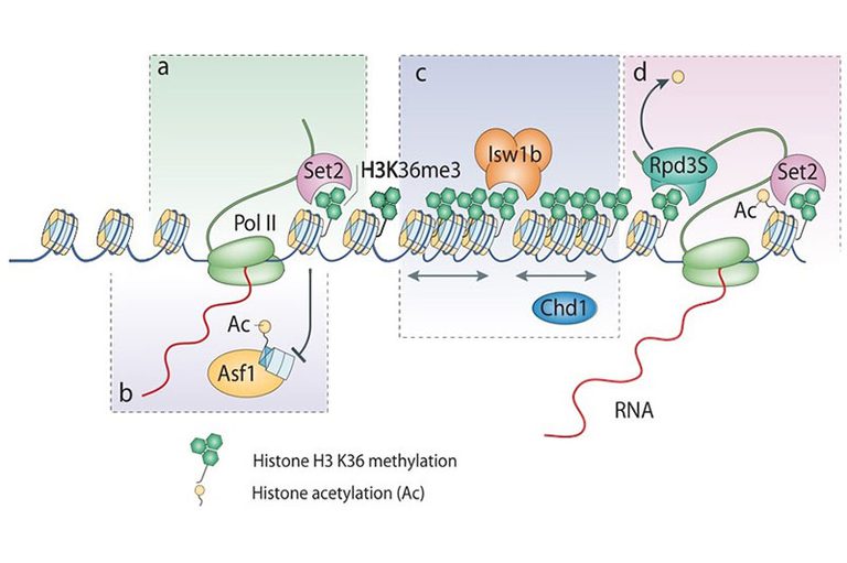 RNA polymerase associated Set2 co-transcriptionally methylates H3K36 which is recognized by the Rpd3S HDAC complex leading to deacetylation of nucleosomes in the open reading frame. In the absence of Set2, H3K36 or Rpd3S nucleosomes in transcribed regions become hyperacetylated. We identified the Isw1b nucleosome remodeling complex as another reader of H3K36me3. These and additional results revealed that Set2-mediated K36 methylation had several functions in restoring chromatin structure behind RNA polymerase. Having worked out the Set2/Rpd3S pathway in yeast we have now turned to study the mammalian Set2 homolog SETD2 (the SET domain-containing methyltransferase).