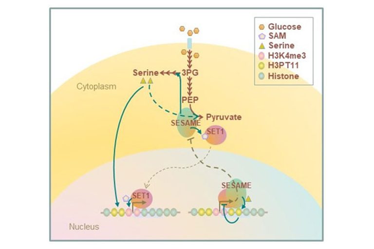 PKM2 is a key enzyme for glycolysis and catalyzes the conversion of PEP to pyruvate, which supplies cellular energy. PKM2 phosphorylates histone H3T11. We found that the yeast PKM2 homologue, Pyk1, is part of SESAME (Serine-responsive SAM-containing Metabolic Enzyme complex). SESAME regulates the crosstalk between H3K4 methylation and H3T11 phosphorylation by sensing glycolysis and glucose-derived serine metabolism. H3Tp11 confers the resistance to oxidative stress in yeast. Furthermore, H3pT11 regulates the transcription of the genes involved in the metabolic transition to the mitochondrial respiratory pathways and the genes related to the nutrient stress responses. The CK2 and Sch9 kinases (not SESAME) are involved in signaling of H3T11 phosphorylation in response to stress and the metabolic transition toward aging. Loss of phosphorylation of H3T11, or loss of CK2 or Sch9 extends chronological lifespan. We are currently studying further molecular mechanism of chromatin modifications in metabolic regulations.