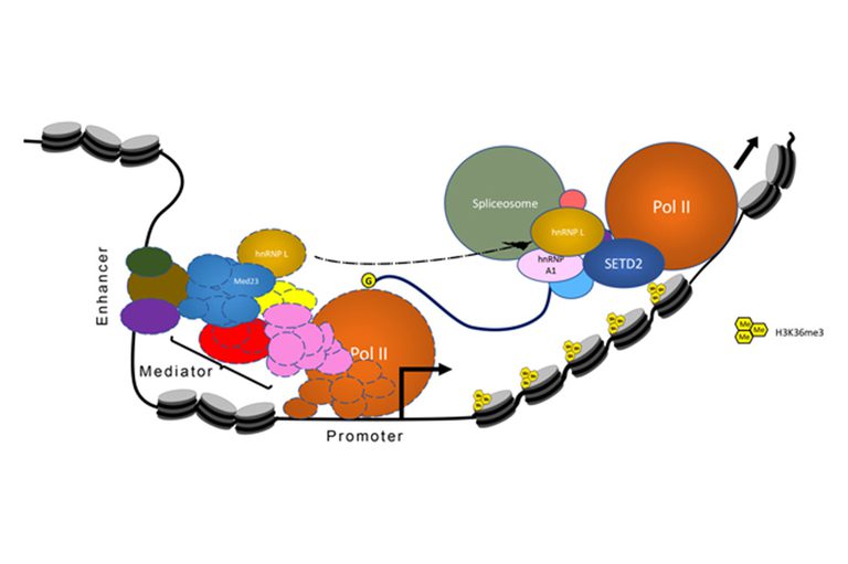 SETD2 trimethylates histone H3 at lysine 36 in mammals. We found that SETD2 specifically interacts with the RNA processing hnRNP proteins. This interaction occurs through a previously uncharacterized domain in SETD2, the SETD2-hnRNP Interaction (SHI) domain, the deletion of which, leads to a reduced H3K36me3 deposition. Functionally, SETD2 regulates a subset of hnRNP L-targeted alternative splicing events. Our findings demonstrate that SETD2, by interacting with Pol II as well as hnRNP L, can mediate the crosstalk between the transcription and the splicing machinery. We were able to integrate our findings with that of Huang et al., Molecular Cell, 2012, to put forward a model where the Mediator Complex component Med23 recruits hnRNP L to the promoter of its target genes, from where it is then handed over to SETD2, which in turn allows hnRNP L to engage its target transcripts.