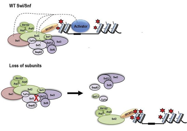 Human SWI/SNF complexes are approximately 2 MDa and composed of 12-15 subunits. There are three distinct mature complexes―BAF (BRG1-associated factor), PBAF (polybromo BRG1-associated factor) and ncBAF (non-canonical). These complexes contain one of the two catalytic ATPase subunits, SMARCA4 (BRG1) or SMARCA2 (BRM,) several core subunits including SMARCC1 (BAF155) and SMARCD1, as well as unique subunits such as ARID1A/B for BAF, and PBRM1 and ARID2 specific for PBAF and GLTSCR1 and BRD9 for ncBAF complexes. Genes encoding many subunits of SWI/SNF complexes have been found to be recurrently mutated in 20% of all human cancers. Multiple subunits are mutated in a wide spectrum of cancers, emphasizing that individual subunits are important in varying cell types and lineages. Hence an understanding of the mechanism by which SWI/SNF regulates transcription and the effect of mutations on proper SWI/SNF function will be important for improved cancer therapy.