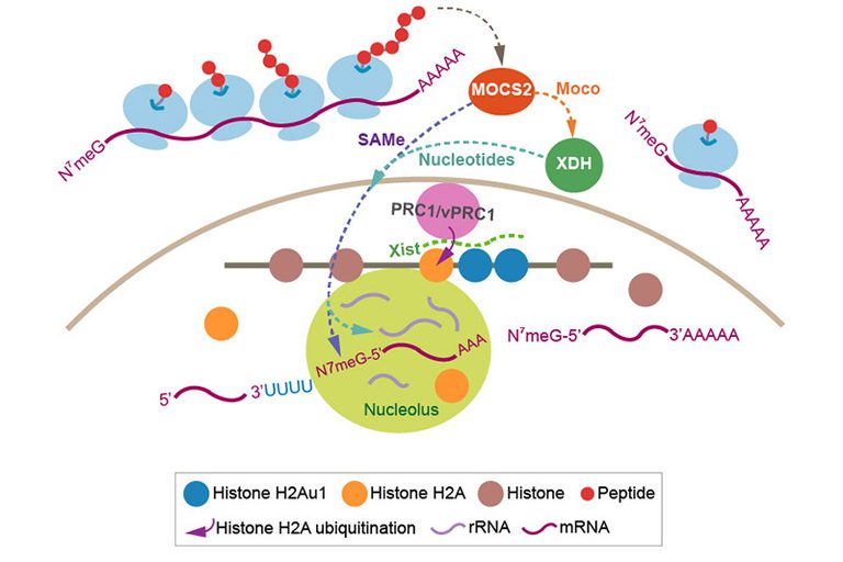 XDH is a molybdenum enzyme involved in the terminal two reactions in the purine catabolic pathway: oxidation of hypoxanthine to xanthine, and oxidation of xanthine to uric acid. We found that translation of MOCS2 is also XDH-dependent. MOCS2 and XDH mediate the association of a polycomb repressive complex 1/noncanonical PRC1 complex (PRC1/vPRC1) with Box C/D small nucleolar ribonucleoproteins. Thus, nucleotide metabolism regulated by MOCS2 and XDH is essential for mRNA loading of genes encoding subunits of PRC1/vPRC1 onto polysomes, and influences RNA synthesis.