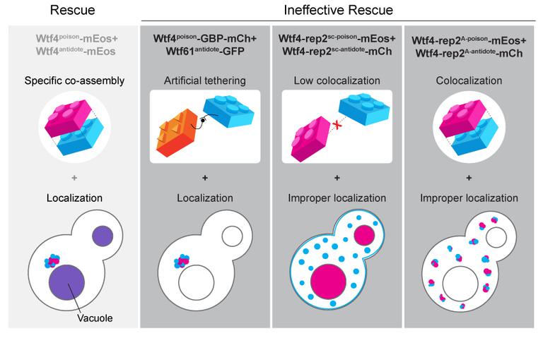 Graphical illustration showing rules for effective and ineffective neutralization of poison proteins. Yeast cells are “rescued” when Wtfpoison and Wtfantidote specifically co-assemble and localize toward the vacuole (left panel). Otherwise, yeast cells are destroyed (right panels).