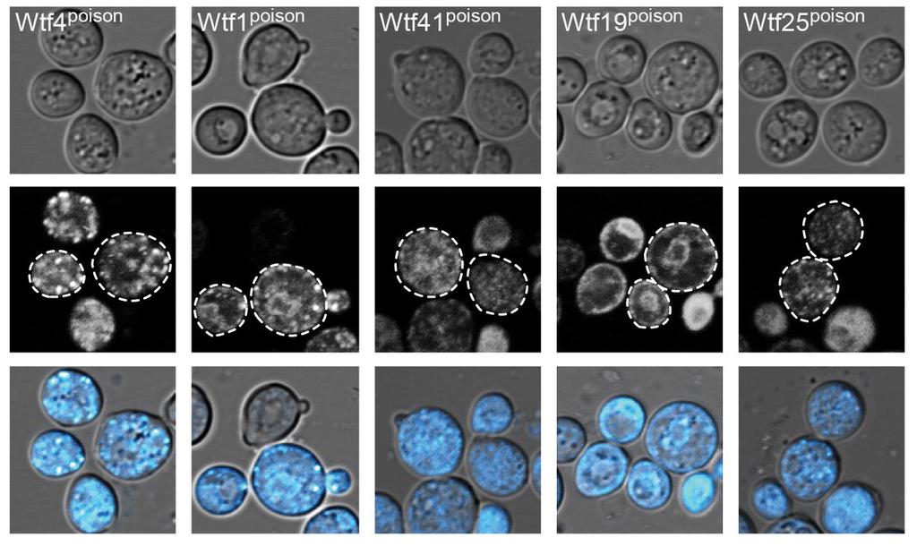 Fluorescent microscopy images of highly variable wtf genes’ poison proteins (Wtfpoison) exhibit similar aggregation and distribution within yeast cells.